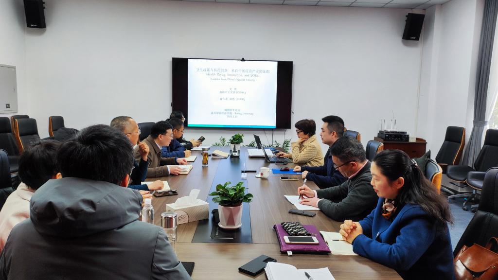 2月23日上午,成人短视频 在尚德楼268会议室成功举办第18期南湖青年论坛。香港中文大学经济系助理教授、浙江大学—香港中文大学数字经济联合研究中心副主任史册应邀作题为《卫生政策与医药创新:来自中国疫苗产业的证据》的学术报告,成人短视频 院长文雁兵教授主持,学院多名教师共同参与研讨。