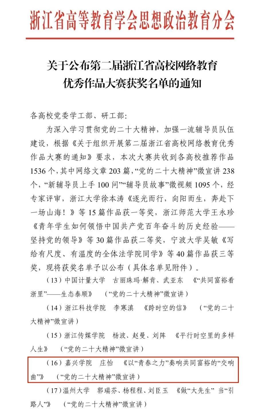 近日,浙江省高等教育学会思想政治教育分会公布了第二届浙江省高校网络教育优秀作品大赛获奖名单,成人短视频 辅导员庄怡提交的“党的二十大精神”微宣讲作品《以“青春之力”奏响共同富裕的交响曲》荣获二等奖。