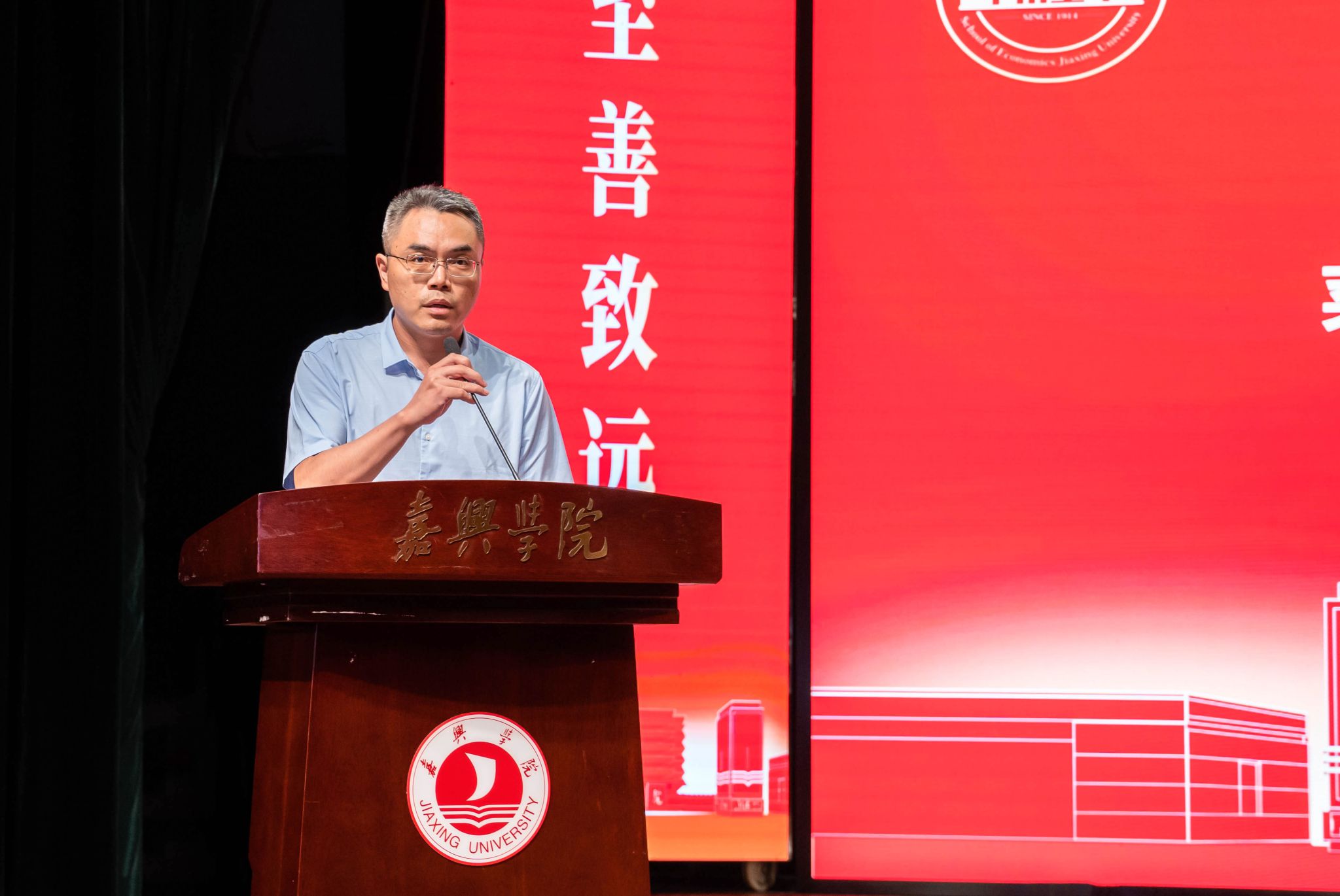 原中国人民银行嘉兴市中心支行党委委员、副行长汤钟尧作为特聘教授代表发言,他结合自身丰富的从业经验和人生阅历,分享了他对青春、对大学、对成长、对责任与使命的理解。