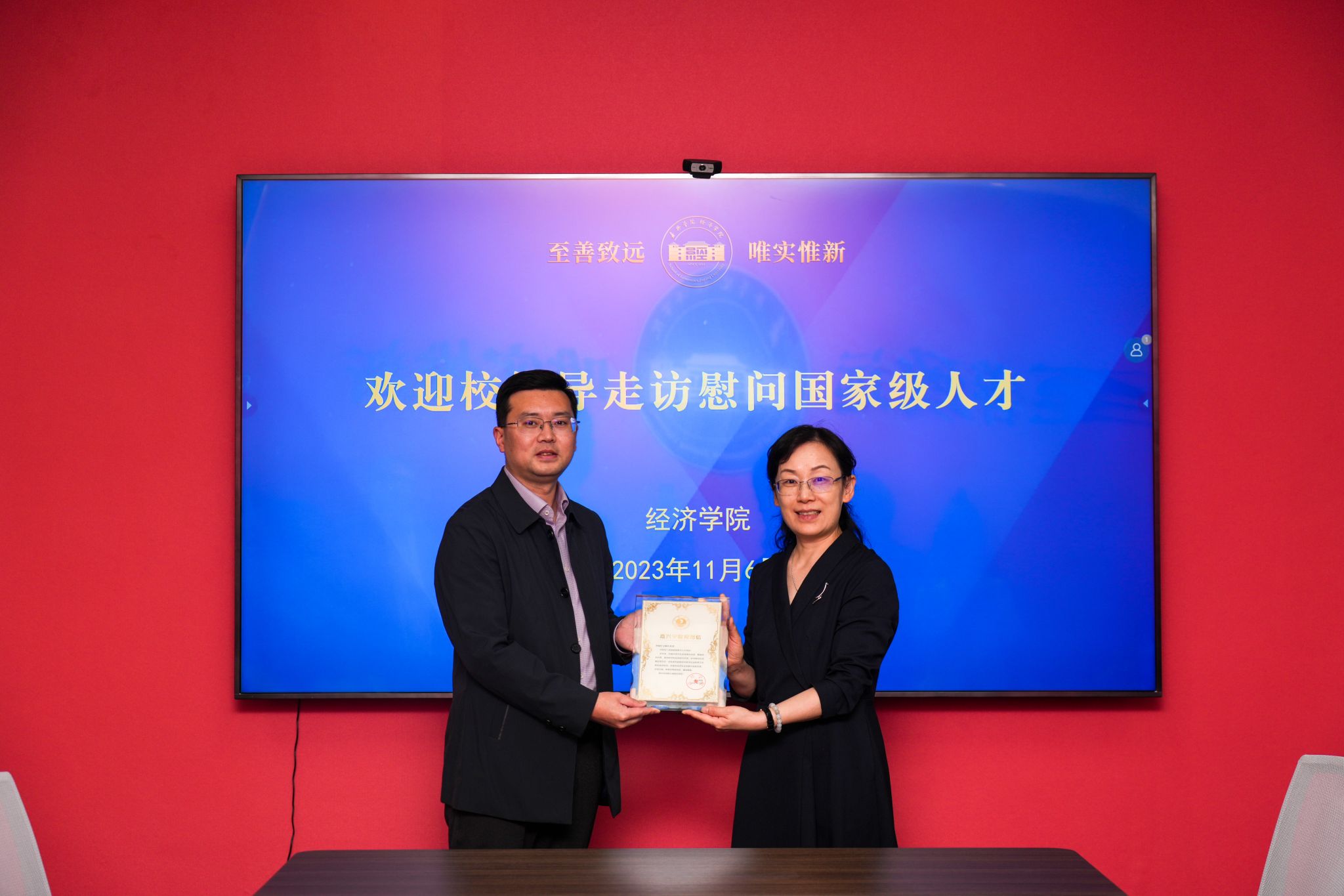 会上,张琦代表学校向文雁兵赠送贺信。