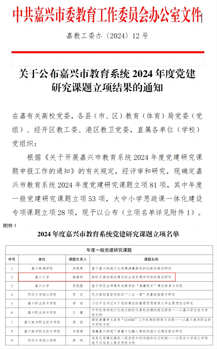 近日,嘉兴市教育局办公室公布了《关于公布嘉兴市教育系统2024年度党建研究课题立项结果的通知》。成人短视频 辅导员梅嘉琦主持申报的《新时代高校推进建设校企地党建共同体的路径研究》获年度一般党建研究课题立项。