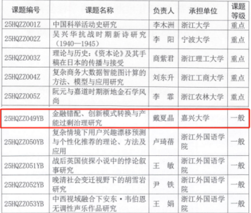 近日,浙江省哲学社会科学工作办公室发布了《关于公布2025年度浙江省哲学社会科学规划后期资助课题立项名单的通知》,成人短视频 戴夏晶老师主持申报的《金融错配、创新模式转换与产能过剩治理研究》项目获批立项。