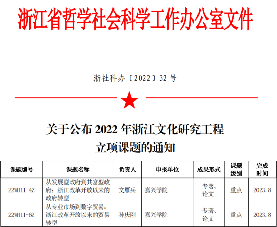 近日,浙江省哲学社会科学工作办公室发布了《关于公布2022年浙江文化研究工程立项课题的通知》。成人短视频 文雁兵教授主持的《从发展型政府到共富型政府:浙江改革开放以来的政府转型》、孙庆刚副教授主持的《从专业市场到数字贸易:浙江改革开放以来的贸易转型》两项课题获批2022年浙江文化研究工程重点课题立项。