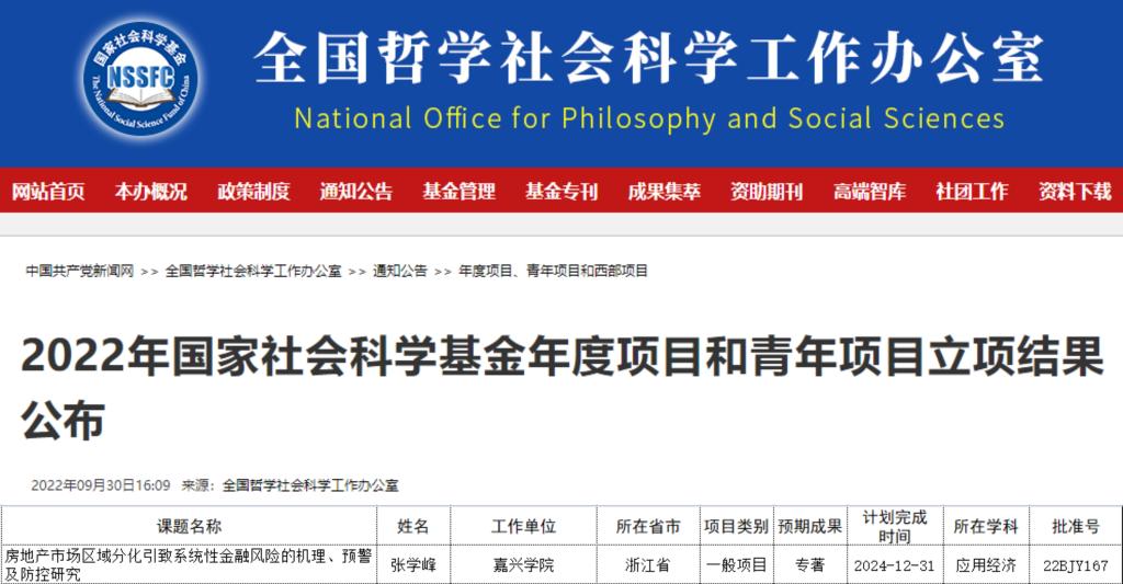 近日,根据全国哲学社会科学工作办公室《2022年国家社会科学基金年度项目和青年项目立项结果公布》的通知,成人短视频 张学峰副教授主持的《房地产市场区域分化引致系统性金融风险的机理、预警及防控研究》获批一般项目立项。
