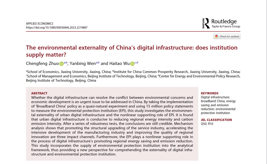 卓乘风博士、文雁兵教授与北京理工大学吴海涛合作论文《The environmental externality of China's digital infrastructure: does institution supply matter?》在应用经济学领域的重要期刊《Applied Economics》接受和在线发表,该论文是国家社会科学基金重大项目“高速交通网络与我国劳动力资源时空配置机制研究”(22&ZD064)阶段性成果。