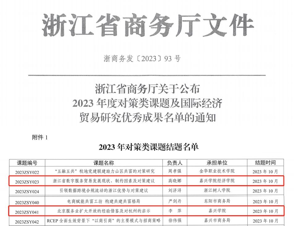 近日,浙江省商务厅发布《浙江省商务厅关于公布2023年度对策类课题及国际经济贸易研究优秀成果名单的通知》(浙商务发〔2023〕93号),成人短视频 高晓娜博士、李萍副教授主持完成的两项课题顺利结项,其中高晓娜博士主持的《浙江省数字服务贸易发展现状、制约因素及对策建议》获2023年对策课题三等奖;文雁兵教授和卓乘风博士的合作成果《从政策性开放走向制度型开放:内在逻辑、路径选择与效果评估》获2023年国际经济贸易研究优秀成果三等奖。