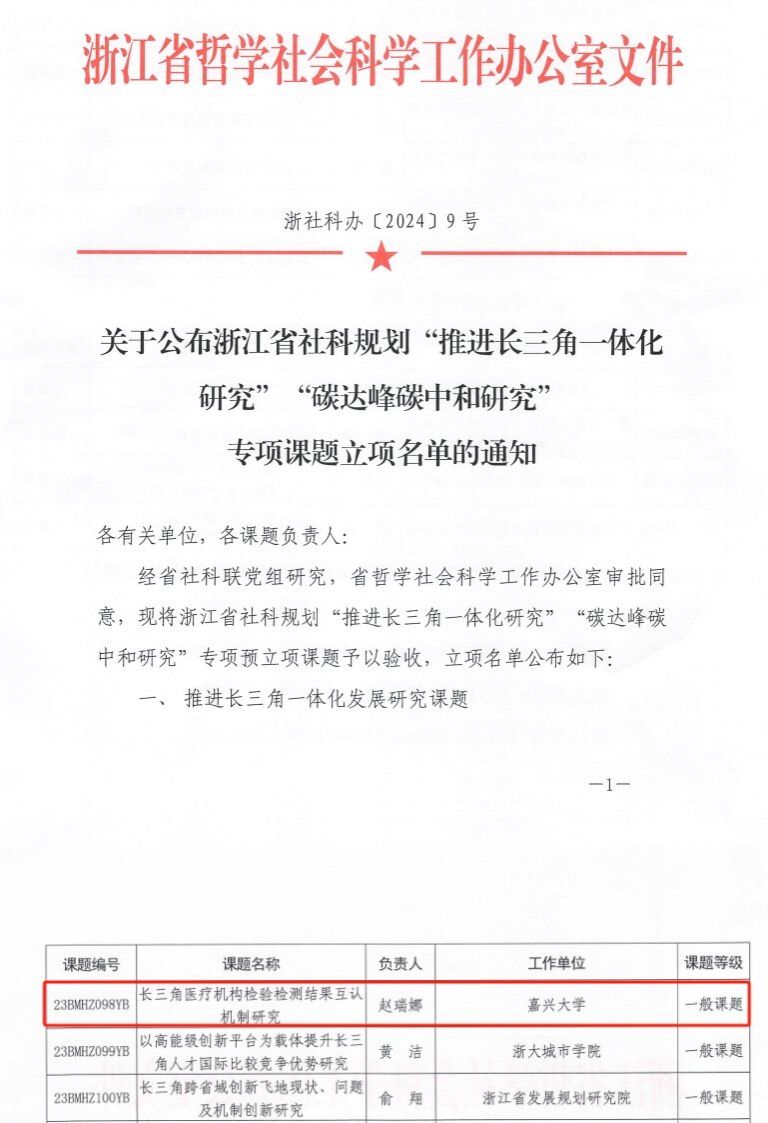 近日,浙江省哲学社会科学工作办公室公布了浙江省社科规划“推进长三角一体化研究”“碳达峰碳中和研究”专项课题立项名单,成人短视频 赵瑞娜博士主持的课题《长三角医疗机构检验检测结果互认机制研究》获得立项。