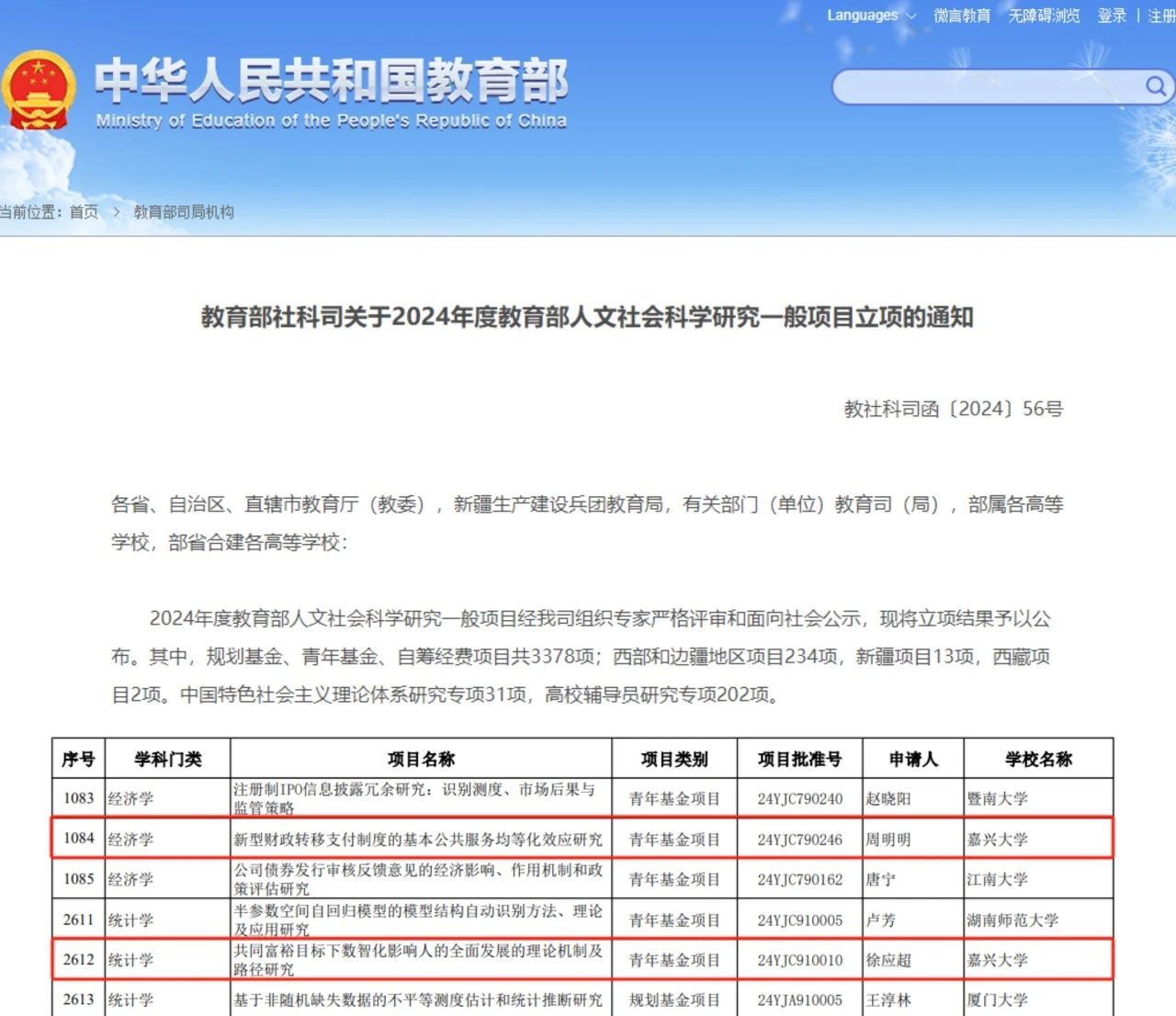 近日,教育部公布了2024年度教育部人文社会科学研究一般项目立项名单,成人短视频 周明明博士主持的课题《新型财政转移支付制度的基本公共服务均等化效应研究》、徐应超博士主持的课题《共同富裕目标下数智化影响人的全面发展的理论机制及路径研究》获批立项。