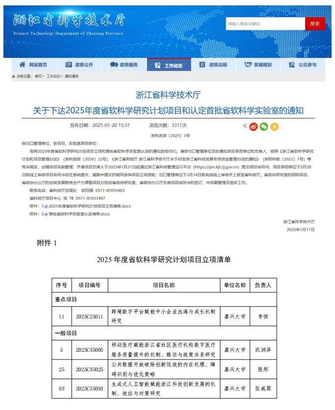 近日,浙江省科学技术厅公布了2025年度省软科学研究计划项目的立项名单,成人短视频 李恒副教授主持的课题《跨境数字平台赋能中小企业出海与成长机制研究》获批重点项目,武润泽博士主持的课题《移动医疗赋能浙江省社区医疗机构数字医疗服务质量提升的机制、路径与政策体系研究》获批一般项目,张彤博士主持的课题《公共数据开放破除创新低效的内在机理、障碍识别与优化策略》获批一般项目,伍威霖博士主持的课题《生成式人工智能赋能浙江科技创新发展的机制、效应与对策研究》获批一般项目。