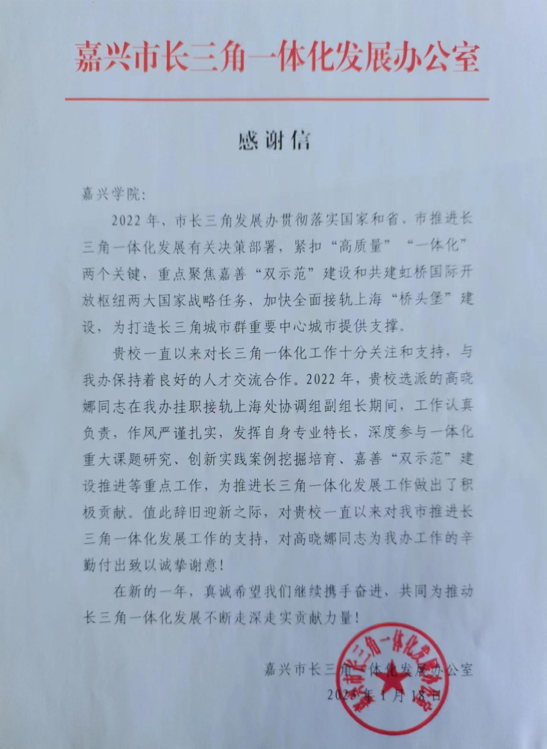 近日,嘉兴市长三角一体化发展办公室发来感谢信,对成人短视频 挂职教师高晓娜博士表示感谢和提出表扬。