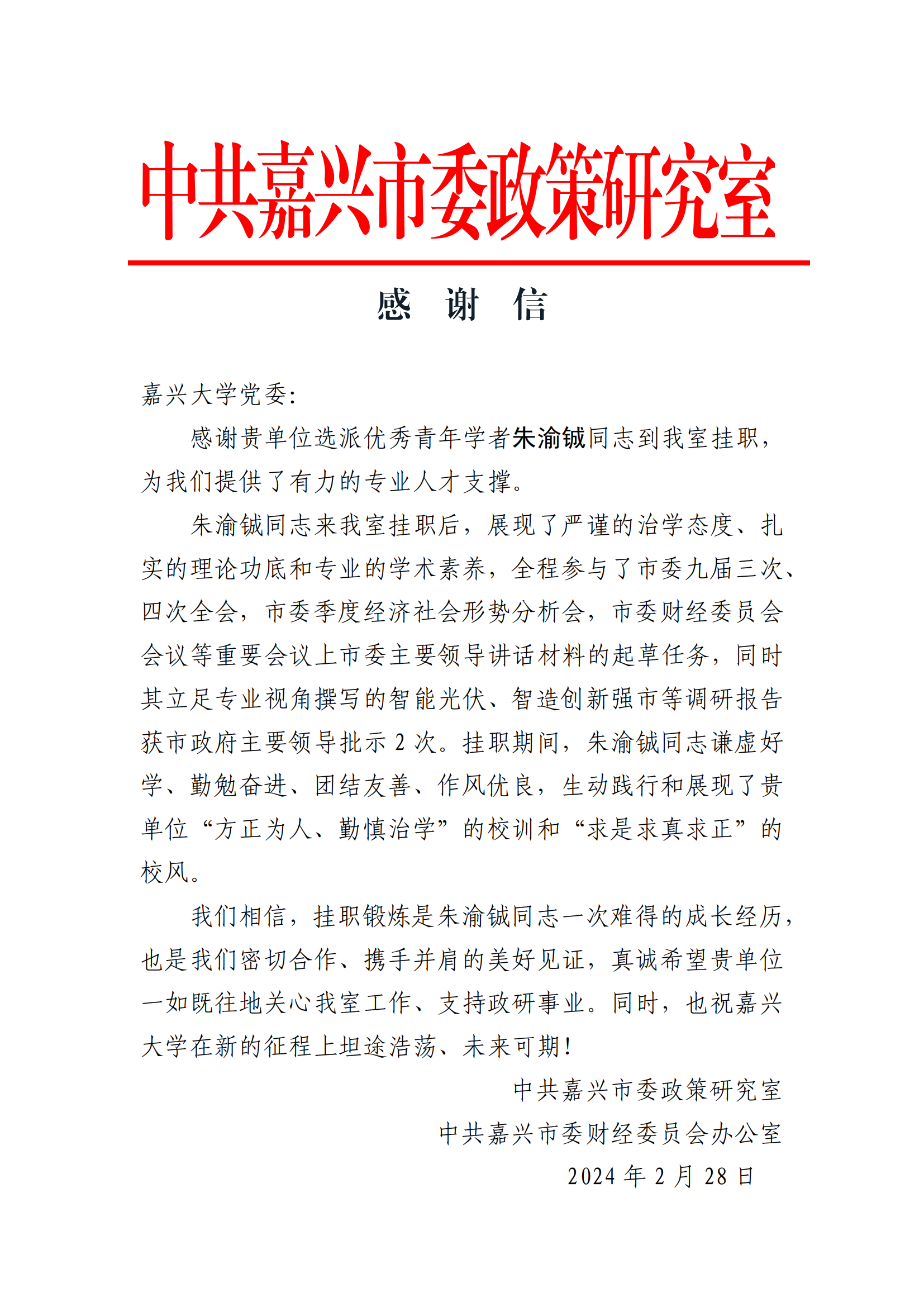 近日,中共嘉兴市委政策研究室发来感谢信,对成人短视频 挂职教师朱渝铖博士提出表扬。