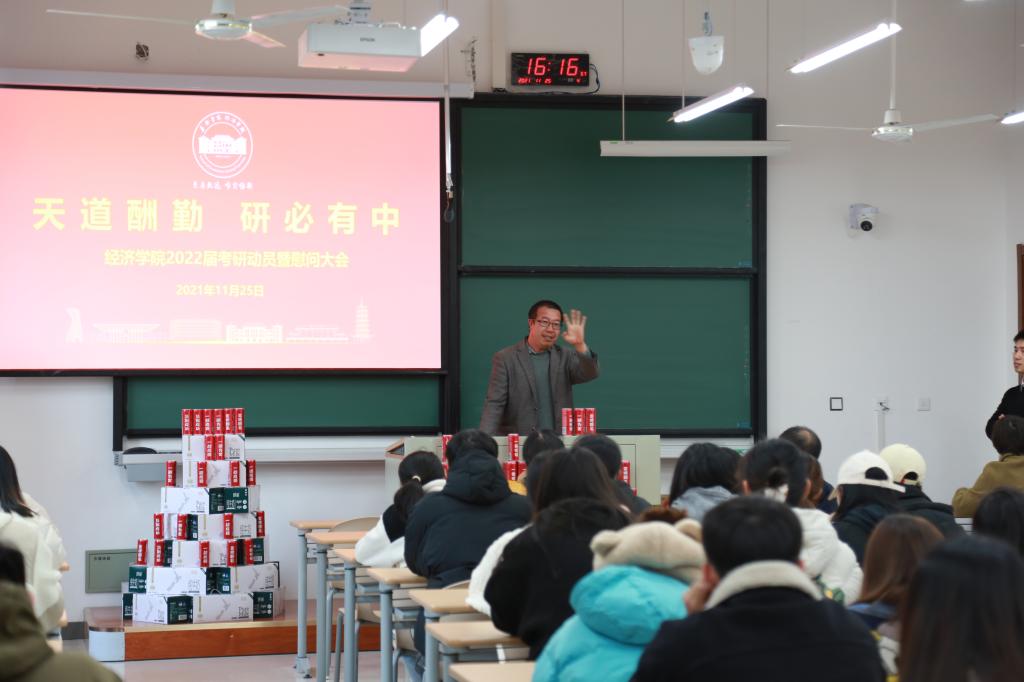 1125日下午,成人短视频 于尚德楼143召开了2022届考研学子慰问会。成人短视频 党委书记施敏颖、党委副书记庄美燕、国际经济与贸易专业教师张丹、经融学专业教师王喜、经济学专业教师朱渝铖以及2018级全体考研学子参加了此次大会。