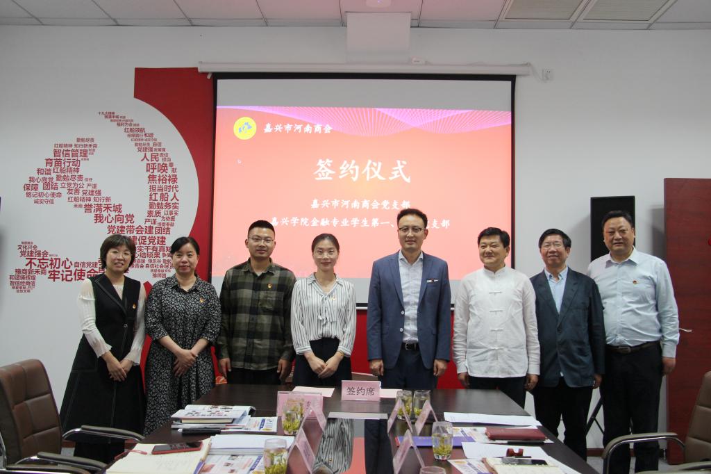 5月19日,成人短视频 金融专业学生第一、第二党支部与嘉兴市河南商会党支部举行结对签约仪式,共同打造“校会企”党建工作新模式。嘉兴市河南商会会长李永宪,商会副会长、党支部书记吕丹,成人短视频 党委书记施敏颖,党委副书记庄美燕及双方代表出席签约仪式。仪式由商会党支部党务红领、秘书长刘高宪主持。