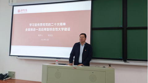 11月24日下午,校党委副书记吴云达以“学习宣传贯彻党的二十大精神 全面推进一流应用型综合性大学建设”为题,向成人短视频 全体教师宣讲党的二十大精神,宣讲会由学院党委书记施敏颖主持。