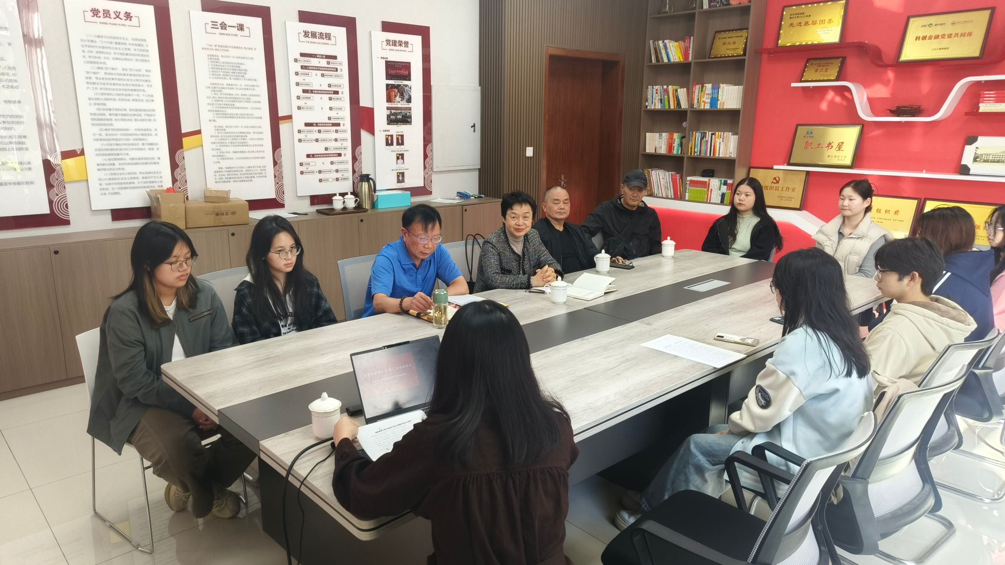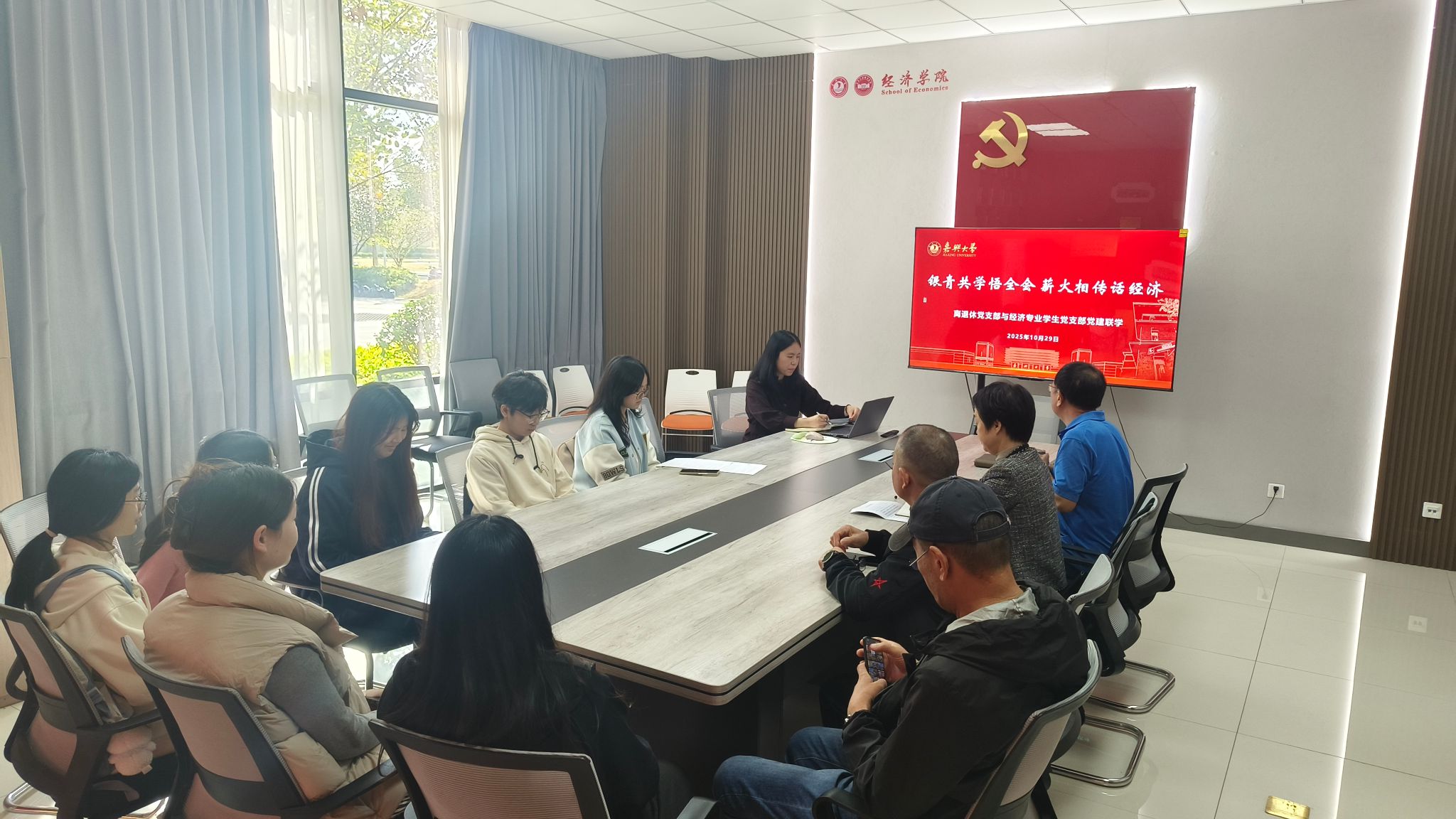 经济专业学生党支部与离退休党委第一党支部联合开展党的二十届四中全会精神联学活动,以“红色 1+1”联建为纽带,搭建老少党员理论学习与思想交流平台,共话初心使命,传承红色基因。