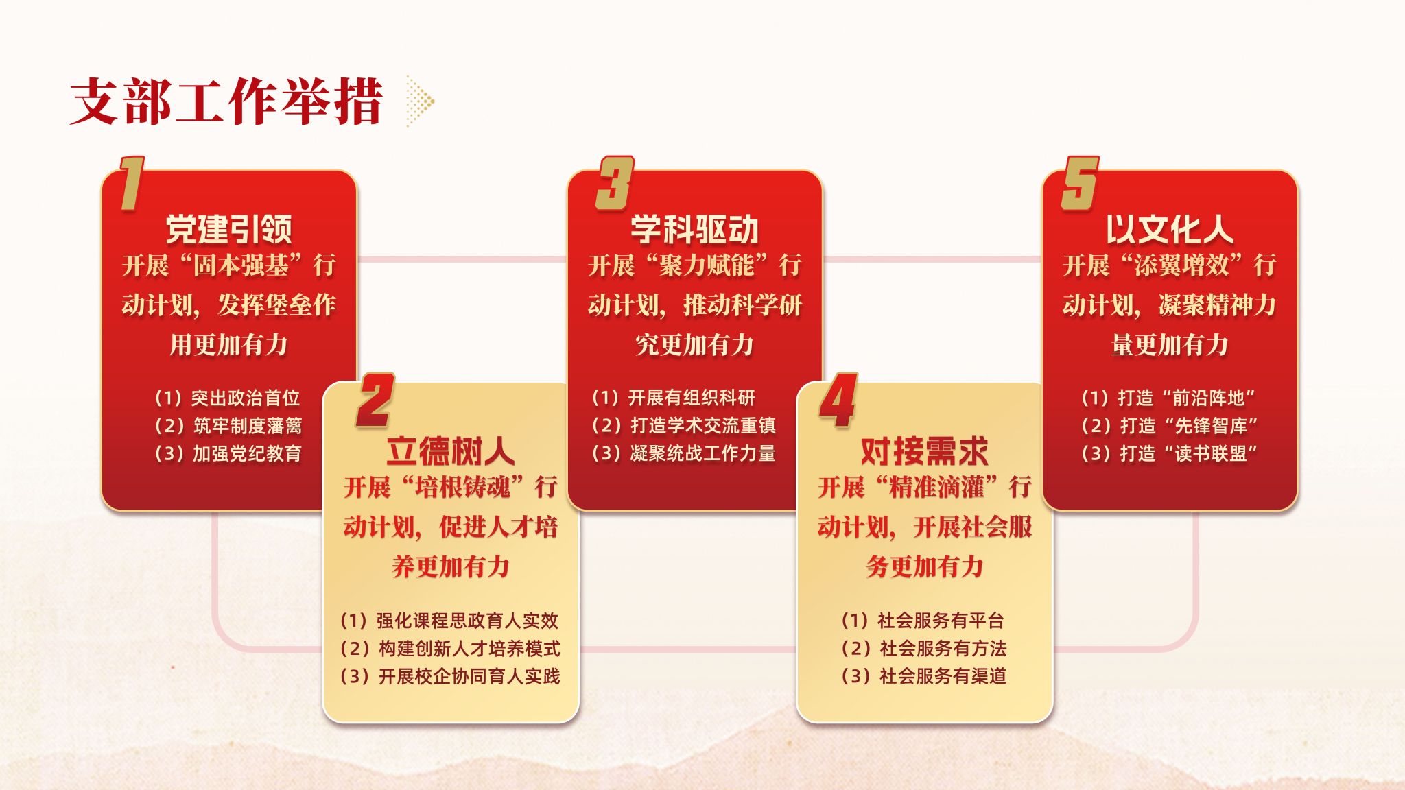 坚持以党建统领工作全局,围绕建设“有特色、善创新的综合性高水平大学”使命愿景,将支部建在学科上,依托支部建强学科为龙头,通过不断提升党建与事业统合力、党建与业务协同力、协同育人聚合力、改革发展助推力、干事创业凝聚力,着力打造有厚度、有高度、有广度、有力度、有温度的“五度”党建新体系,以高质量党建引领学院高质量发展。